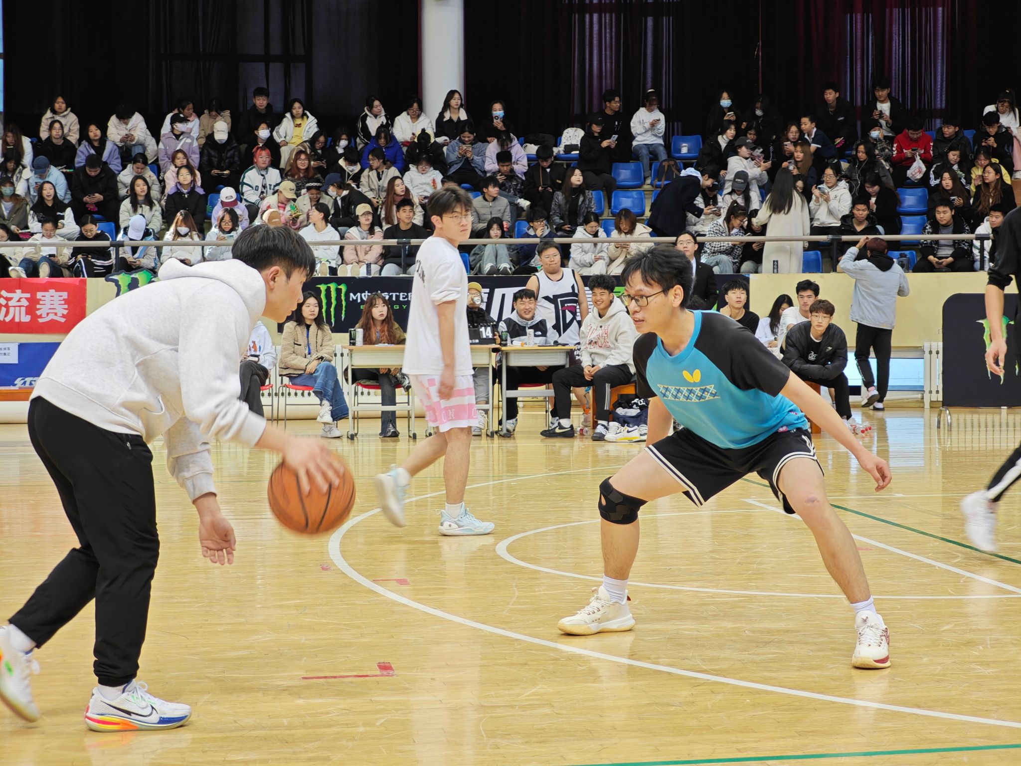 球场上,双方队员们个个精神抖擞、斗志昂扬。本次交流赛的参赛双方为23级老生与24级新生,分别进行了男子5v5,男子3v3,女子3v3的三轮比赛。随着裁判的一声哨响,比赛正式开始。队员们迅速进入状态,他们在球场上奔跑、跳跃、传球、投篮,每一个动作都充满了力量与激情。进攻方队员们配合默契,通过巧妙的传球和灵活的跑位,一次次突破防线,创造出绝佳的投篮机会。防守方队员们也毫不示弱,他们紧紧盯住对手,积极拼抢,用顽强的防守阻止对方得分。
